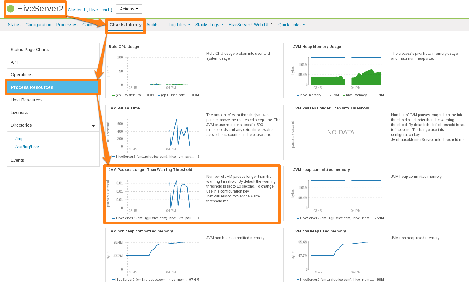 - In the Process Resources section of the Charts Library page, view the JVM Pause Time and the JVM Pauses Longer Than Warning Threshold charts for signs that JVM has paused to manage resources. For example: