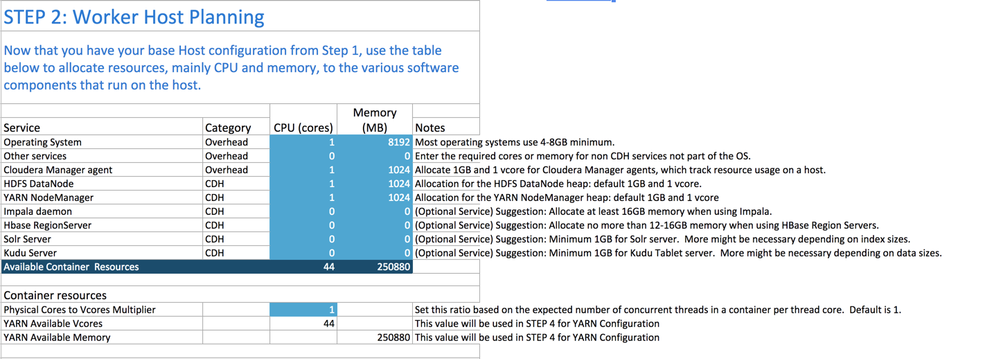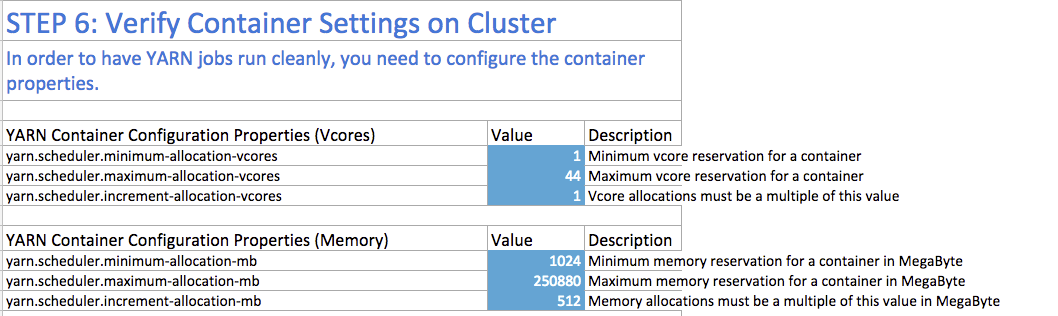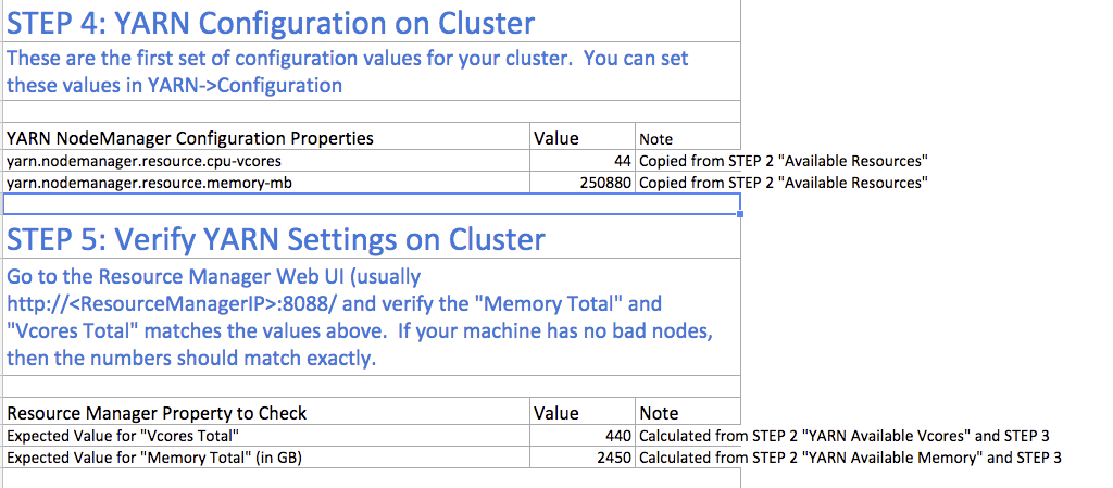 Step 4 pulls forward the memory and vcore numbers from step 2. Step 5 shows the total memory and vcores for the cluster.
