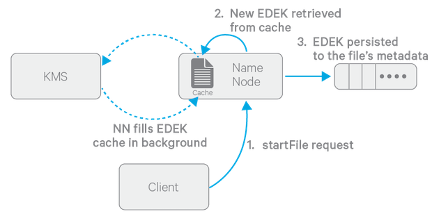 The diagram above depicts the process of writing a new encrypted file. Note that the EDEK cache on the NameNode is populated in the background. Since it is the responsibility of KMS to create EDEKs, using a cache avoids having to call the KMS for each create request. The client can request new EDEKs directly from the NameNode.