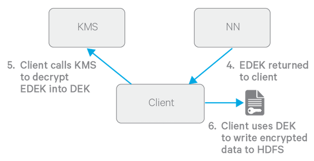 To decrypt a file, the HDFS client provides the NameNode with the file's EDEK and the version number of the EZ key that was used to generate the EDEK. The NameNode requests the KMS to decrypt the file’s EDEK with the encryption zone's EZ key, which involves checking that the requesting client has permission to access that particular version of the EZ key. Assuming decryption of the EDEK is successful, the client then uses this DEK to decrypt the file.