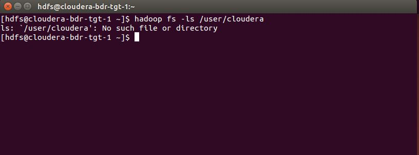 The example backup cluster has not been used as the destination of a replication schedule yet, so the HDFS file system has no /user/cloudera directory: