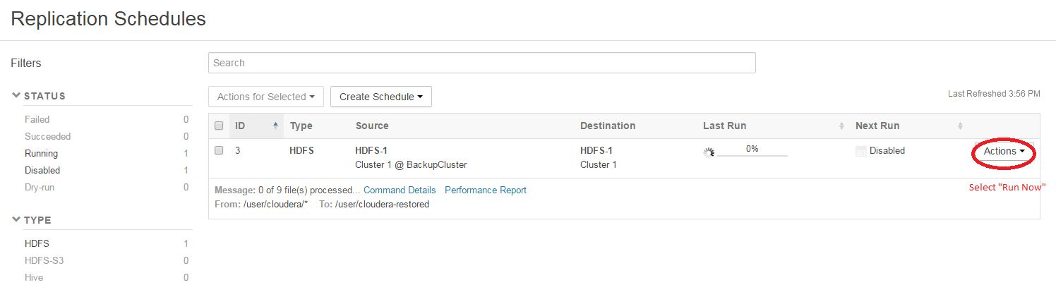 At this point, until you need to actually restore production HDFS data files, you can leave the Replication Schedule disabled.