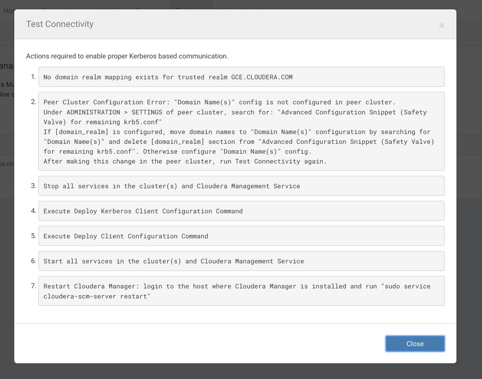 This feature is available when the source and destination clusters run Cloudera Manager 5.12 or later. You can disable the Kerberos connectivity test by setting feature_flag_test_kerberos_connectivity to false with the Cloudera Manager API: api/<version>/cm/config.