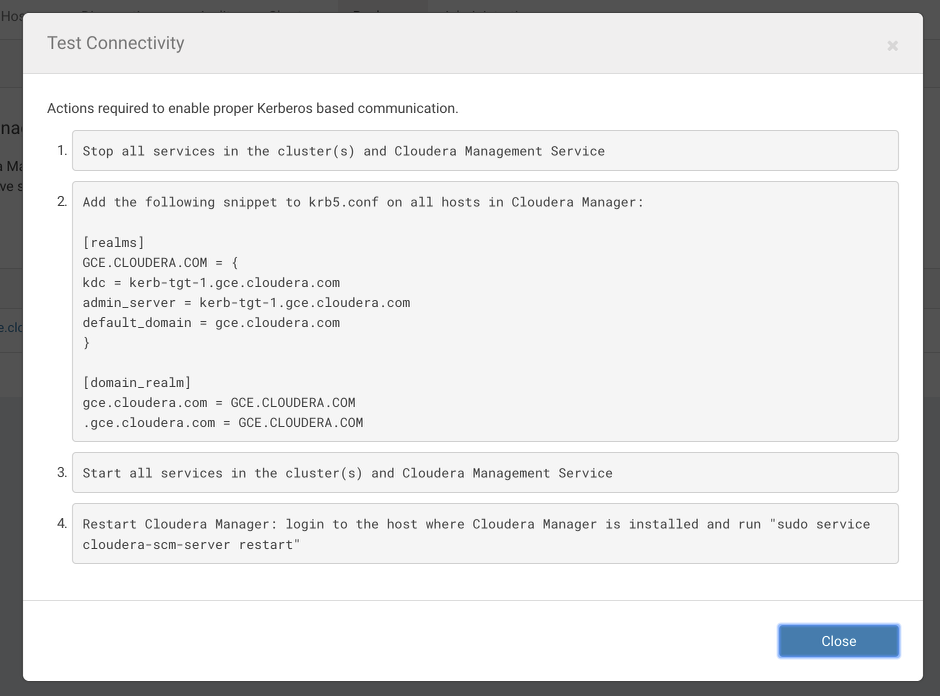 If Cloudera Manager manages the Kerberos configuration file, Cloudera Manager configures Kerberos correctly for you and then provides the set of commands that you must manually run to finish configuring the clusters. The following screen shots show the prompts that Cloudera Manager provides in cases of improper configuration: