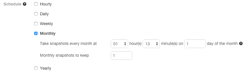 - Specify the snapshot Schedule. You can schedule snapshots hourly, daily, weekly, monthly, or yearly, or any combination of those. Depending on the
