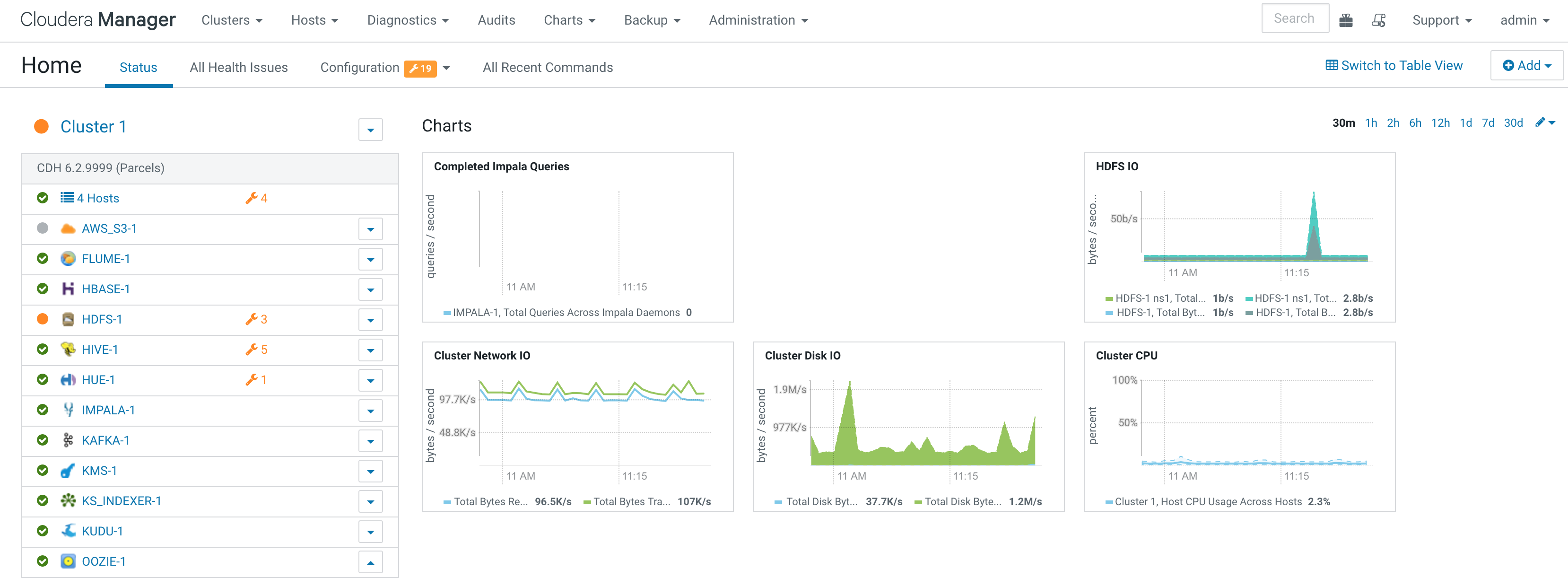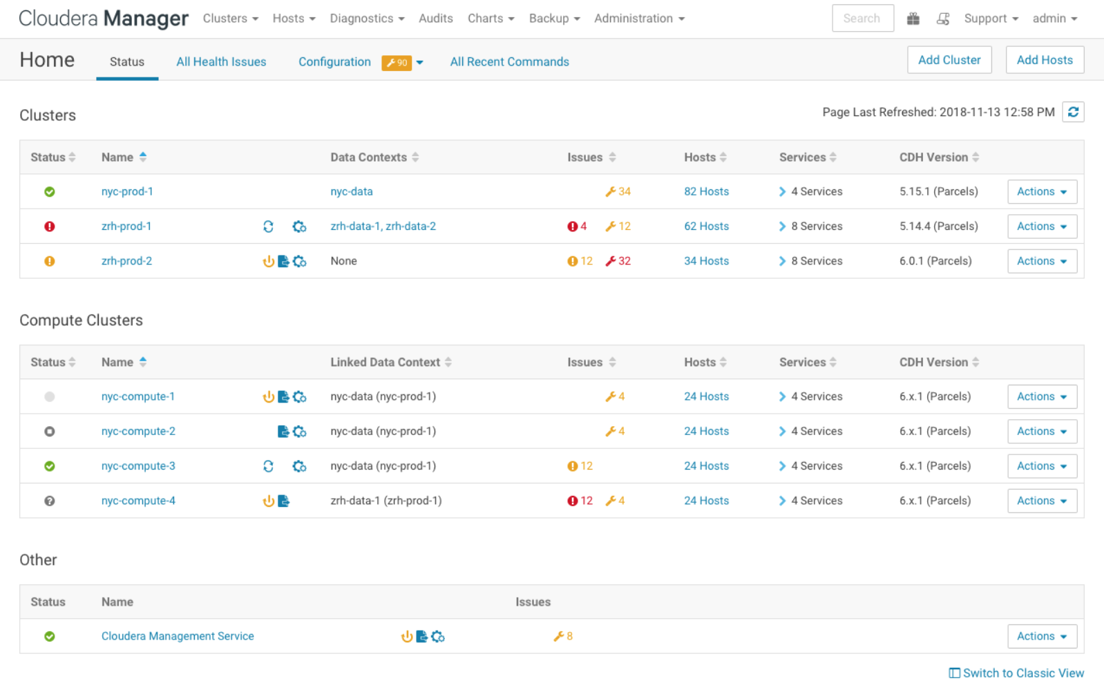 The Status tab has two potential views: Table View and Classic View. The Classic View contains a set of charts for the selected cluster, while the Table View separates regular clusters, compute clusters, and other services into summary tables. You can use the Switch to Table View and Switch to Classic View links on each view to switch between the two views. Cloudera Manager remembers which view you select and remains in that view.