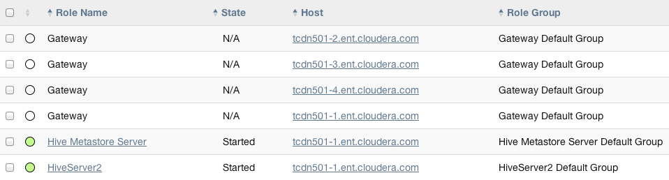 In the cluster we discussed earlier, the three hosts (tcdn501-[2-5]) that do not have Hive role instances have Hive gateways: