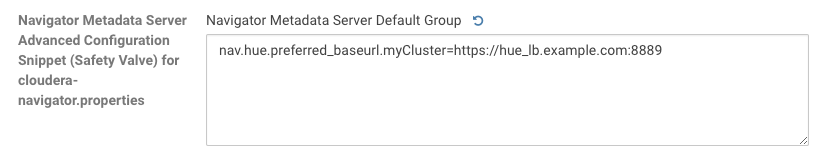 - Scroll to the property Navigator Metadata Server Advanced Configuration Snippet (Safety Valve) for cloudera-navigator.properties.
