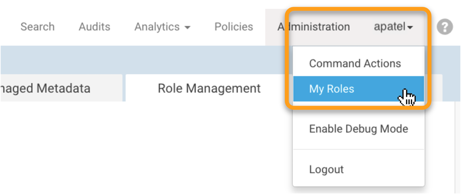 From the Cloudera Navigator console, you can verify the user roles associated with your current login by selecting My Roles from the account drop-down menu.