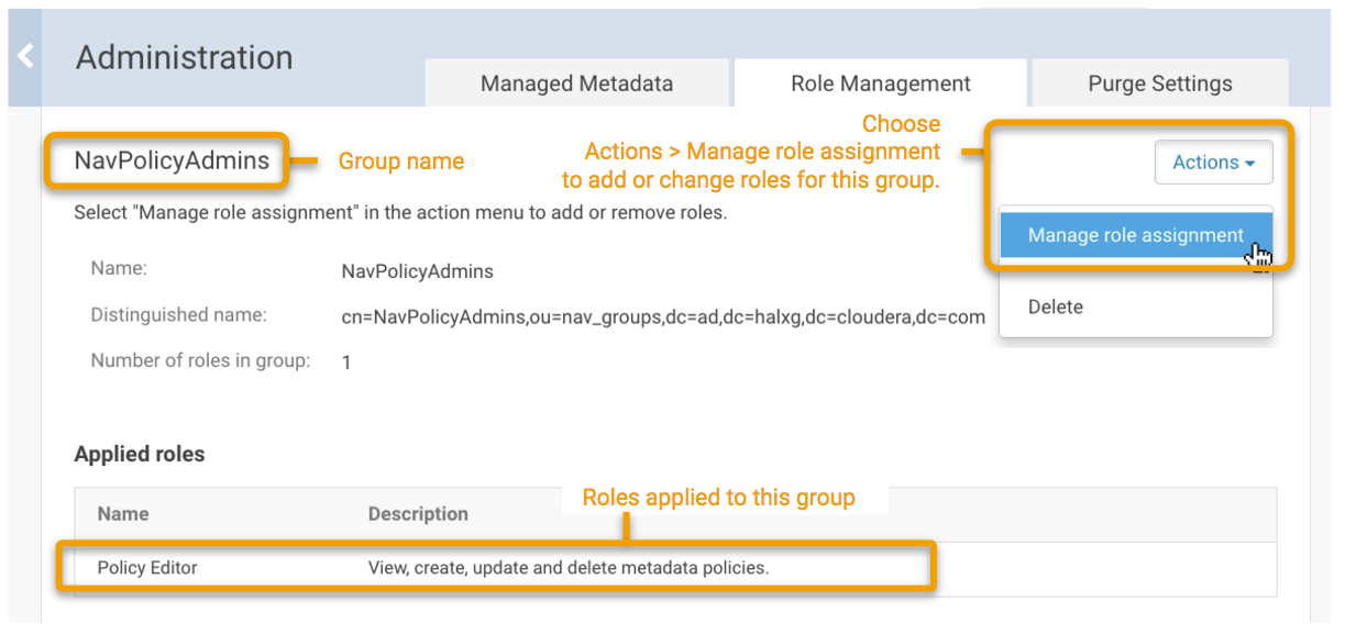 Cloudera Navigator user roles can be assigned to groups that are managed by an external LDAP-compliant identity/authentication system (Active Directory, OpenLDAP) using the Role Management tab of the Cloudera Navigator console. The Role Management feature only becomes available in the Cloudera Navigator console after the external system has been successfully configured for use by Cloudera Navigator. See Authentication for Cloudera Navigator for configuration details.