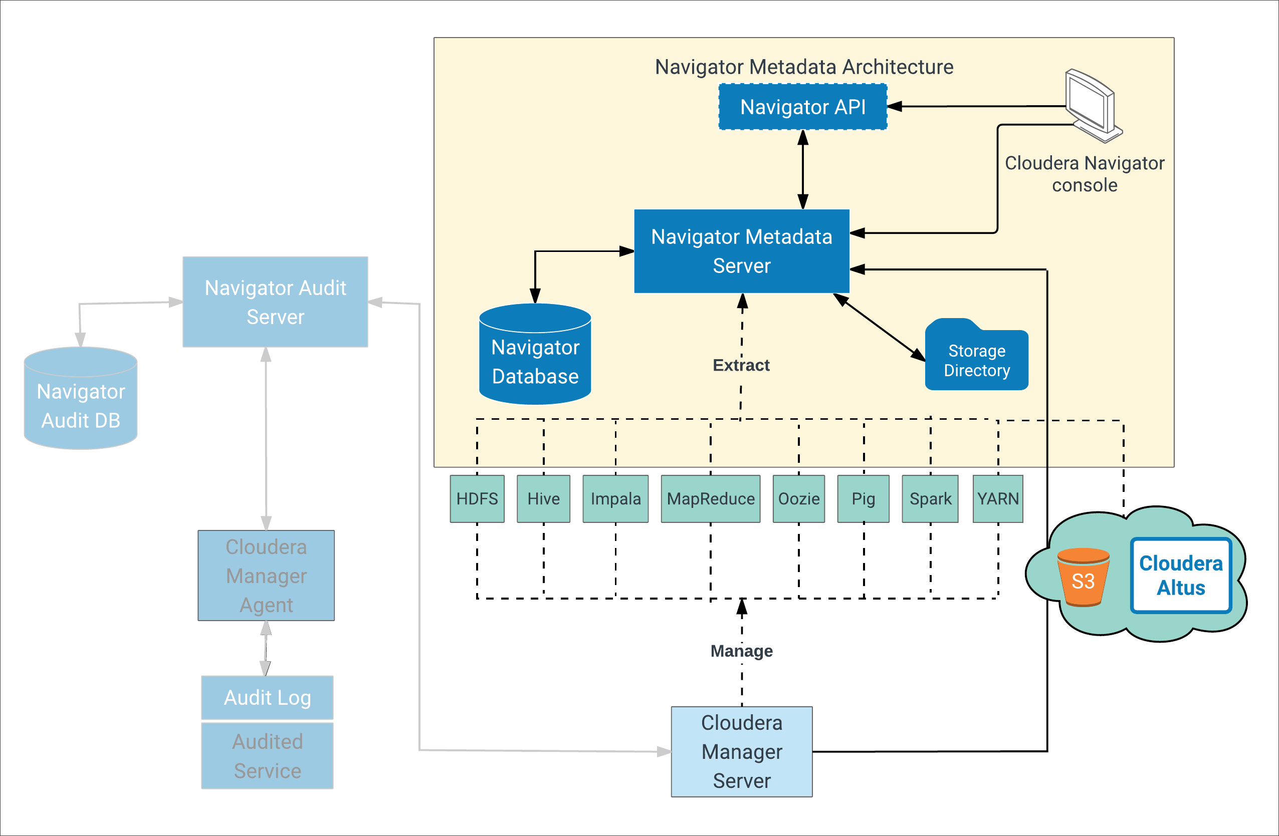 The figure below shows a high-level view of the key components that make up the Cloudera Navigator Metadata Architecture. Extracting, indexing, and storing metadata from cluster entities, both on-premises and in the cloud, are some of the important processes implemented by this architecture. As shown in the figure below, Cloudera Navigator can also extract metadata from entities stored on cloud services (Amazon S3) and from clusters running on Amazon EC2 or Cloudera Altus.