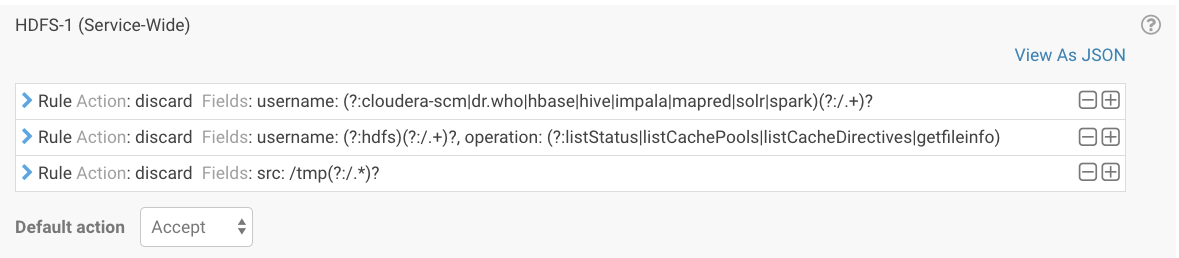 If you find that the audit events include references to automated tasks against HDFS or other services that you don't want to include in your audit, you can include the tasks in a "discard" filter. For example, to discard all tasks performed against HDFS by the user under which the automated tasks are performed, create an HDFS filter: