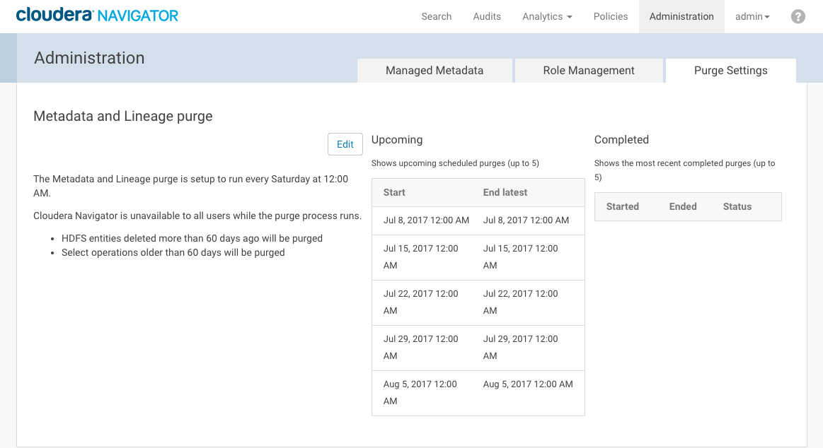 Option Default Range of selectable values and usage note How often Weekly Not configurable. The purge runs weekly per your specifications for Day and Time. It is enabled by default. Day Saturday Select a day for the purge that will have minimal impact to your user community. Time 12 Midnight Hourly time, from 12 Midnight through 11 PM. Select a time that will have minimal impact on production. Maximum purge duration 12 hours Set the amount of time you want to allow for the purge process to run. If not already complete, the HDFS purge process will not add any new items to purge after your specified duration. Entities purged to that point remain purged. All non-HDFS purge processes will run without limit. If set to 0, the purge is disabled. No other Cloudera Navigator operations, including through the console, can occur during the purge process.