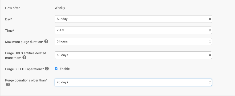 Purge HDFS entities deleted more than* 60 days The number of days after an entity is deleted that elapse until the purge process removes its metadata. For example, a setting of 1 day purges entities deleted before two days ago but retains entities deleted yesterday. Purge SELECT operations* Enabled Hive and Impala SELECT operations older than days specified in Only Purge SELECT operations older than will be purged. Purge operations older than* 60 days Yarn, Sqoop, and Pig operations older than the specified date will be purged. If Purge SELECT Operations is enabled, Hive and Impala SELECT operations older than the specified date will also be purged. - Click Save when finished.