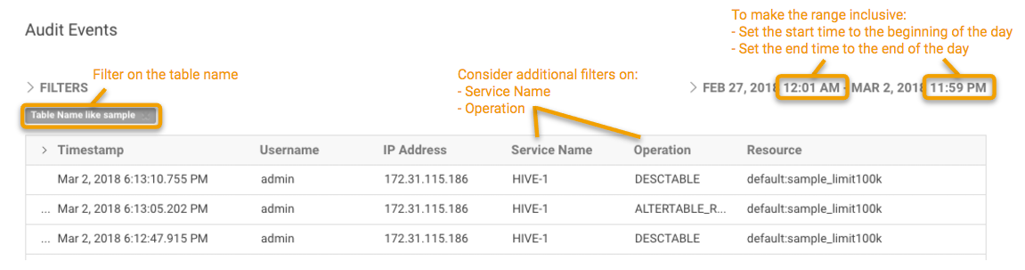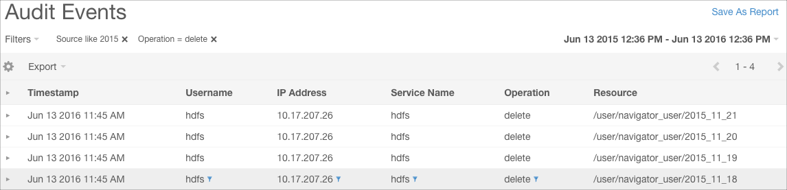 To view Audit Events in the Cloudera Navigator console and apply filters: