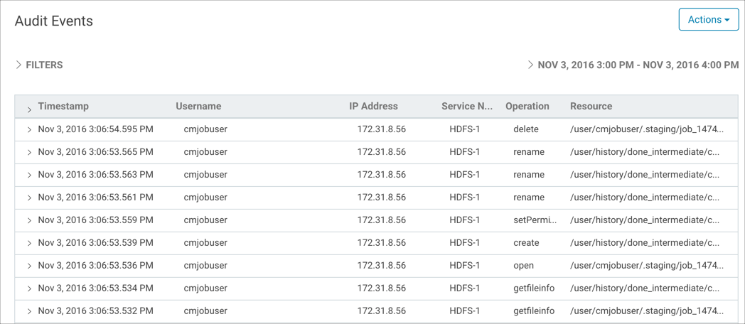 Actions performed on the cluster by users and by services are tracked by Cloudera Navigator. Using the filters available on the Audit page of the Cloudera Navigator console lets you quickly find answers to a variety of questions such as: