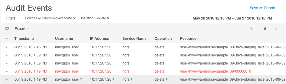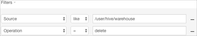 5. Click Apply. The filter to select delete operations is added to the list of filters and applied to Audit Events. An updated Audit Events list is returned, showing only delete operations for sources similar to /user/hive/warehouse.