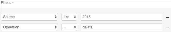 5. Click Apply. The operation filter added to the list of filters and applied to Audit Events, returning an updated list containing Audit Events for delete operations from sources like 2015.