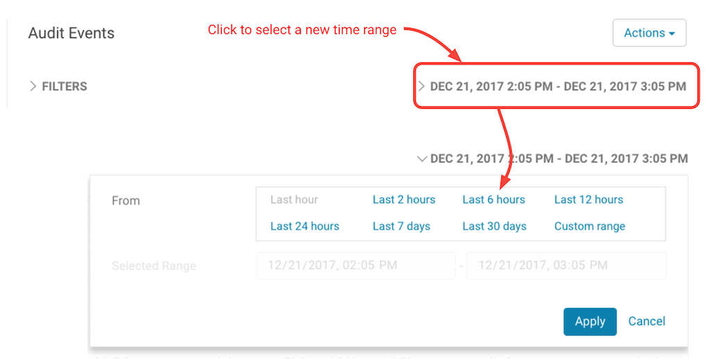 - Click the date-time range at the top right of the Audits tab to open a range selector.