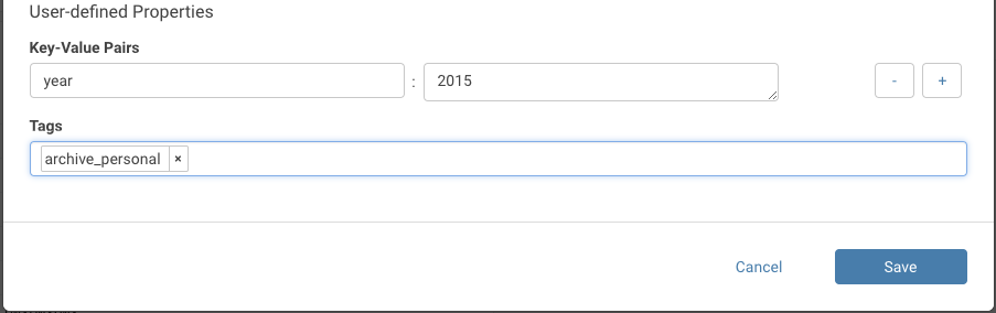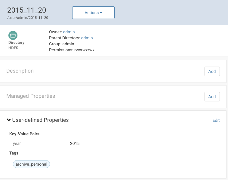 In the following example, the tag archive_personal and the property year with value 2015 are added to the HDFS directory 2015_11_20: