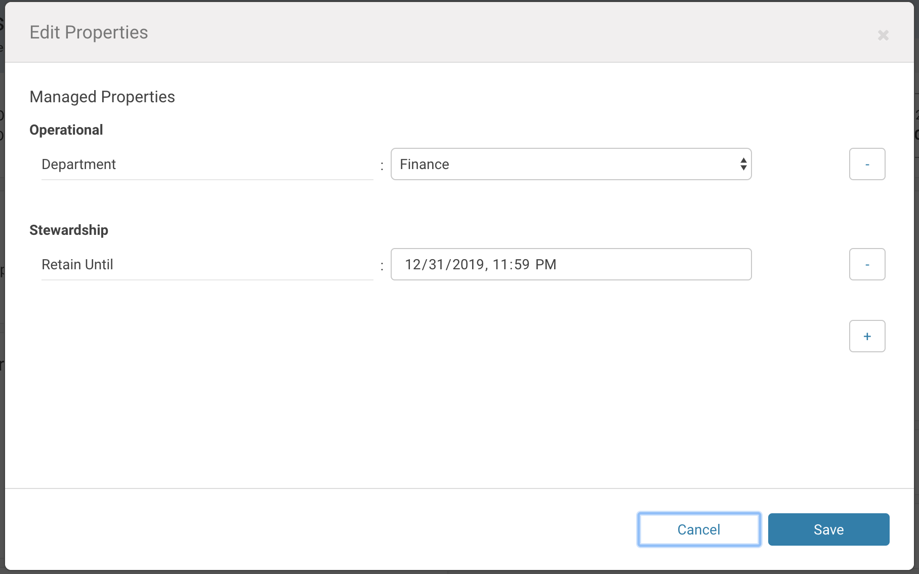 - Select a Managed Property to add the value appropriate for this entity. Click the plus icon (+) to add another managed property key-value pair or another value for a given key.