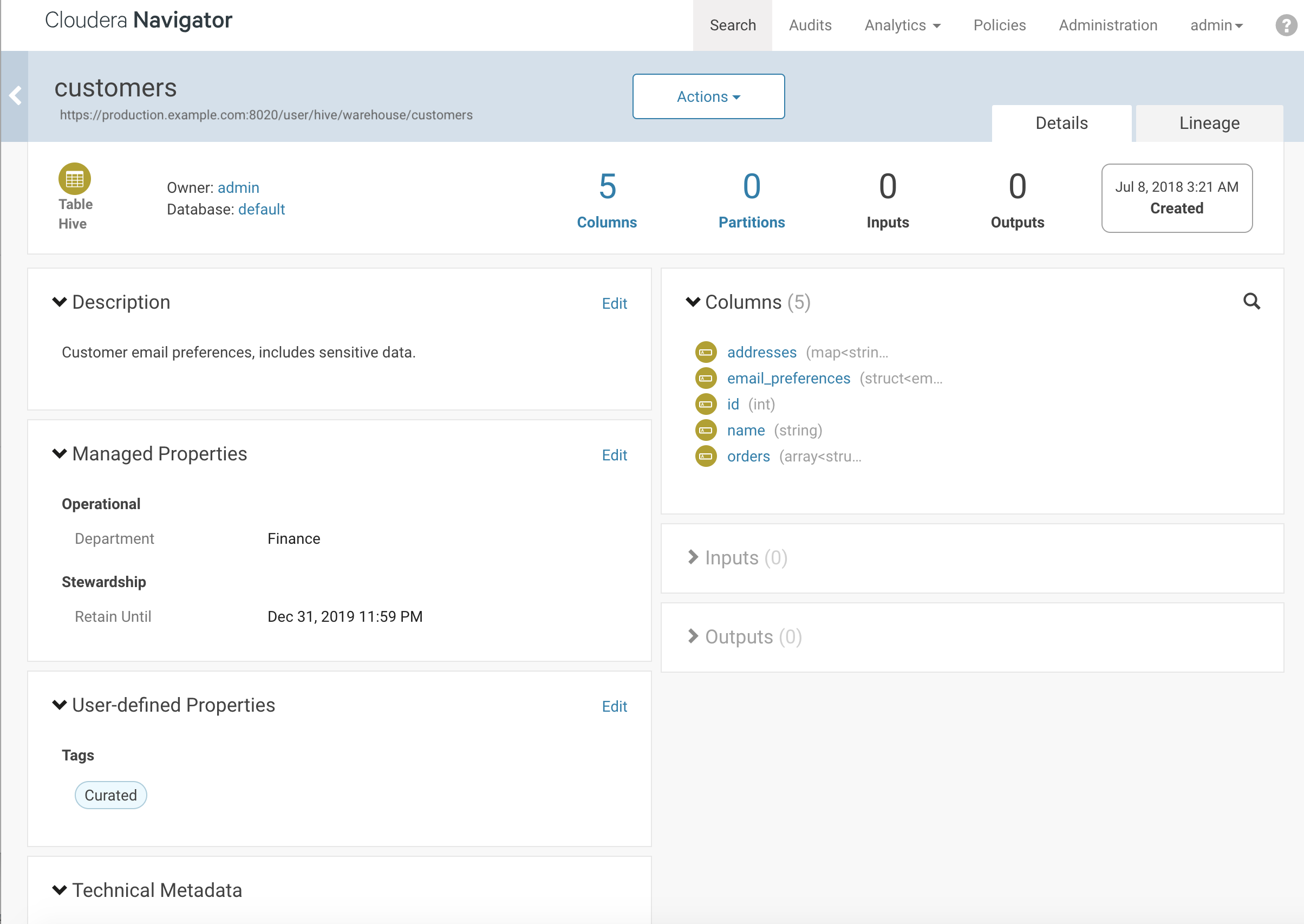 The following example shows the Department and Retain Until managed properties for the customers Hive table entity: