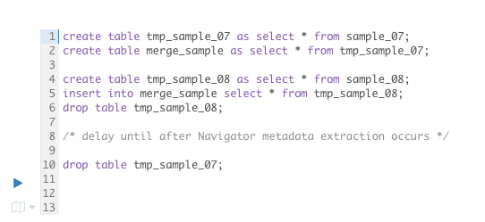 Assume that the temp_sample_08 table was created and dropped between two metadata extractions and that the temp_sample_07 DROP TABLE command is run only after metadata extraction occurred.