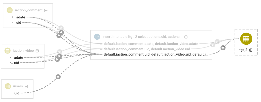 When Navigator has column level information, the lineage diagram shows a + next to the name of the object. Opening the column level information shows you how columns in source tables contribute to columns in the destination tables. Columns referenced in joins or lookups are indicated with dashed lineage relations and appear when the view includes control flow information. (Move the cursor over a column to highlight only that column's lineage through all the objects.) Because the information is generated by HMS, column-level tracing is available regardless of the underlying compute engine.