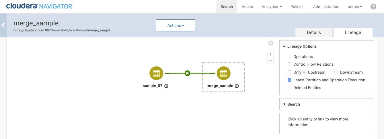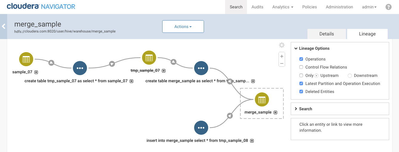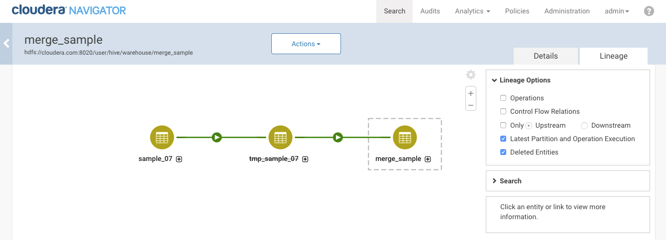 If the Navigator-HMS extractor runs when the first table was present, Navigator will create a metadata entity for the first table. When Navigator links the details of the operation with known entities, it will translate the operation details into a lineage diagram including the first and second tables. After the table is deleted and when the next extraction runs, Navigator Metadata Server flags the entity for the first table as deleted. The lineage diagram for the second table shows the first table as deleted (you may have to enable Deleted Entities in the lineage view options). The operation and operation executions still show in the lineage diagram.