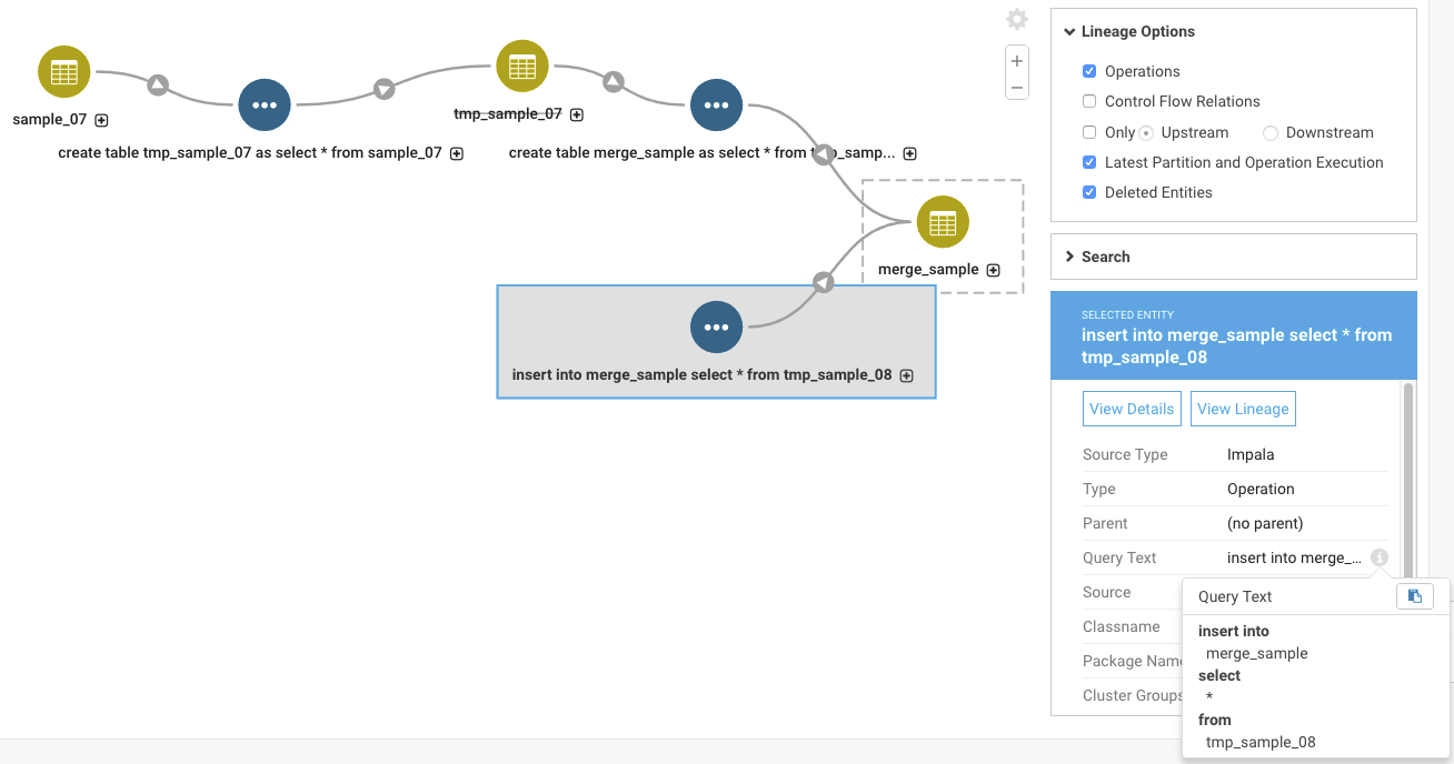 Turning on the option for Operations shows the queries that created and inserted rows into the sample_merge table. Note in particular that the operation shows for inserting data into the sample_merge table from the temporary table temp_sample_08 even though the table was not captured by a metadata extraction.