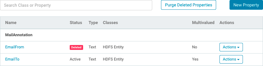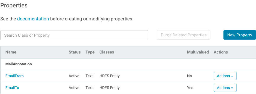 The following figure shows two properties in the namespace MailAnnotation that apply to entities of the HDFS Entity class (HDFS files and directories). The emailFrom property is of type TEXT and can be assigned a single value. The MailTo property is also of type TEXT but can have multiple values.
