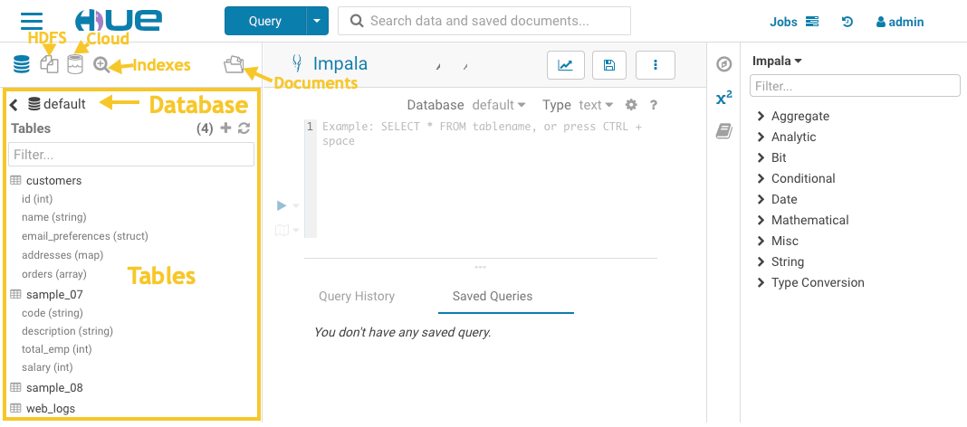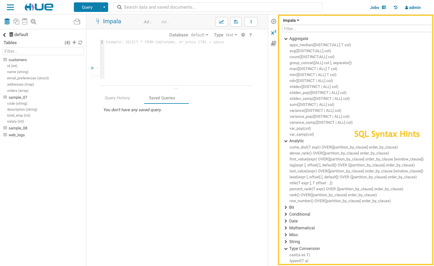 The assistant panel on the right provides expert advice and hints for whatever application is currently being used in the central panel. For example, in the above image, Impala SQL hints are provided to help construct queries in the central panel.