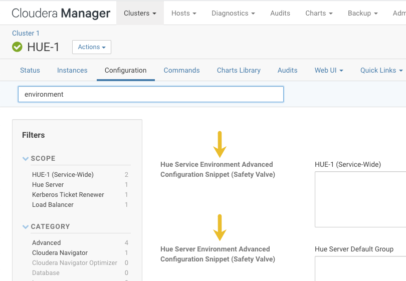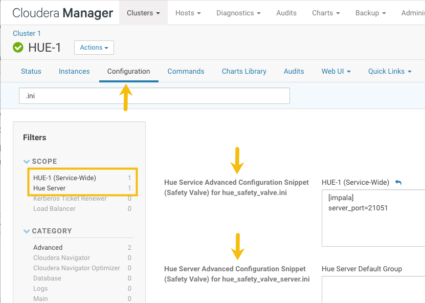 Important: Do not edit the .ini files at the command line because they are stored in dynamic directories named by process ID and populated from the Cloudera Manager database.ls -ltr /var/run/cloudera-scm-agent/process/`ls -valrt /var/run/cloudera-scm-agent/process | grep HUE_SERVER | tail -1 | awk '{print $9}'`