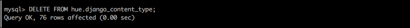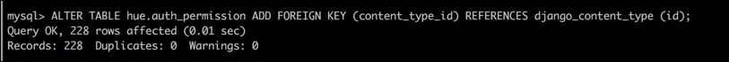 ALTER TABLE hue.auth_permission DROP FOREIGN KEY content_type_id_refs_id_<value>;For example, if you used the above output from the SHOW CREATE TABLE statement, you would use the following ALTER TABLE statement:
