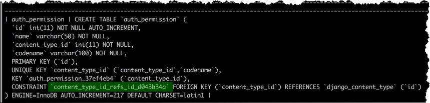 SHOW CREATE table hue.auth_permission; ALTER TABLE hue.auth_permission DROP FOREIGN KEY content_type_id_refs_id_id value;