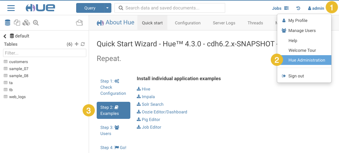 Not every action in the Hue UI touches the Hue database (embedded or custom). This page explains how to populate the database with user account information, Hive queries, and Oozie workflows. This is useful when testing the migration of a database.