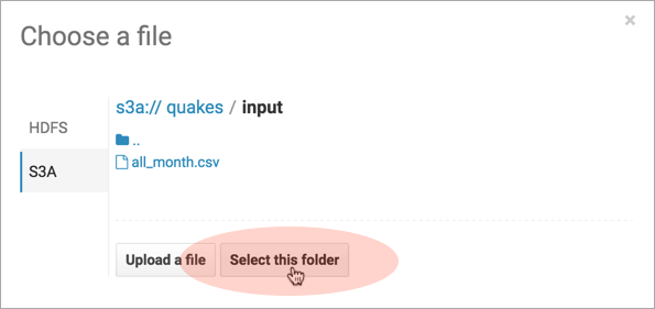- Click Upload and select, or drag, all_month.csv. The path is s3a://quakes/input/all_month.csv.