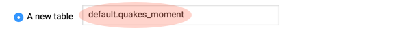 SELECT time, latitude, longitude, mag FROM `default`.`earthquakes` WHERE magtype IN ('mw','mwb','mwc','mwr','mww'); - Select A new table and input <database>.<new table name>.