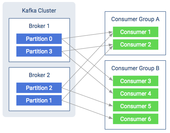 As shown in the figure below, both consumer groups share the partitions and each partition multicasts messages to both consumer groups. The consumers pull messages from the broker instead of the broker periodically pushing what is available. This helps the consumer as it won’t be overloaded and it can query the broker at its own speed. Furthermore, to avoid tight looping, it uses a so called “long-poll”. The consumer sends a fetch request to poll for data and receives a reply only when enough data accumulates on the broker.