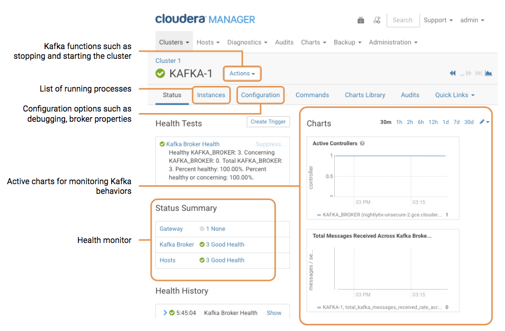 Cloudera Manager is the recommended way to administer your cluster, including administering Kafka. When you open the Kafka service from Cloudera Manager, you see the following dashboard: