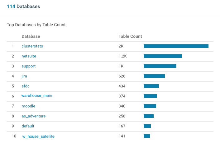 The Databases area of the Dashboard shows the total number of databases in the source clusters. The top 10 databases, by table count, are displayed in the bar graph.