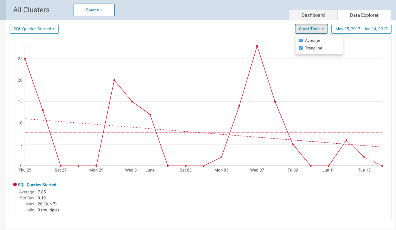 Administrators can look for trends, the administrator navigates to the Data Explorer tab, makes two selections to filter for the past several weeks on SQL Queries Started as source type and gleans some clues about a rogue SQL query.