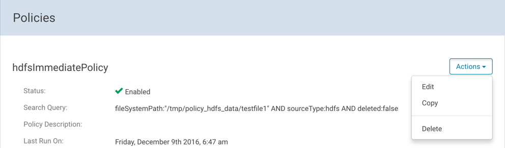 You can also edit, copy, or delete a policy from the policy details page by clicking the Actions button.