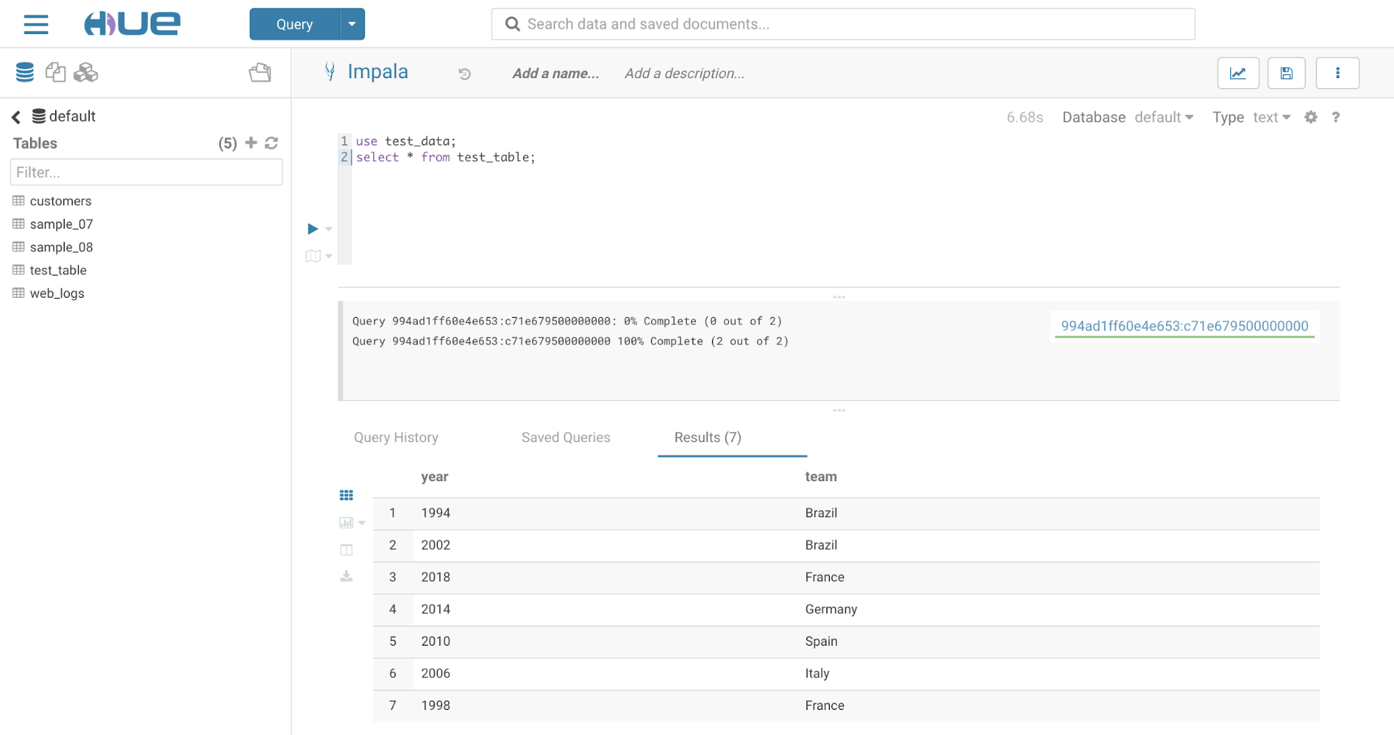 [vpc_host-cqdbms-2.tut.myco.com:25003] test_data> select * from test_table; Query progress can be monitored at: https://vpc_host-cqdbms-2.tut.myco.com:25000/query_plan?query_id=be4c4c177520a5fd:7efba74700000000 +------+---------+ | year | winner | +------+---------+ | 2018 | France | | 2014 | Germany | | 2010 | Spain | | 2006 | Italy | +------+---------+
