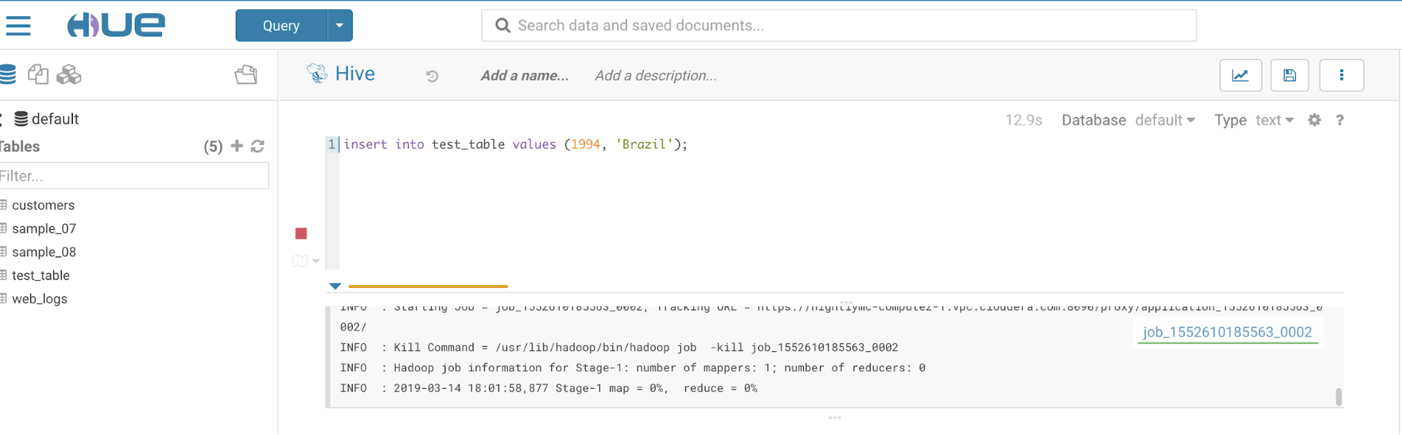 INFO : Compiling INFO : Executing command(queryId=hive_20190309192705_218b79aa-aa94-4102-95ab-a1d4bc7a0381): insert into test_table values (2002, 'Brazil') WARN : INFO : Query ID = hive_20190309192705_218b79aa-aa94-4102-95ab-a1d4bc7a0381 INFO : Total jobs = 3 INFO : Launching Job 1 out of 3 INFO : Starting task [Stage-1:MAPRED] in serial mode INFO : Submitting tokens for job: job_1552095496593_0001 INFO : The url to track the job: https://vpc_host-nnwznq-1.tut.myco.com:8090/proxy/application_1552095496593_0001/ INFO : Starting Job = job_1552095496593_0001, Tracking URL = https://vpc_host-nnwznq-1.tut.myco.com:8090/proxy/application_1552095496593_0001/ hdfs://ns1/user/hive/warehouse/test_data.db/test_table/.hive-staging_hive_2019-03-09_19-27-05_193_3963732700280111926-1/-ext-10000 from hdfs://ns1/user/hive/warehouse/test_data.db/test_table/.hive-staging_hive_2019-03-09_19-27-05_193_3963732700280111926-1/-ext-10002 INFO : Starting task [Stage-0:MOVE] in serial mode INFO : Loading data to table test_data.test_table from hdfs://ns1/user/hive/warehouse/test_data.db/test_table/.hive-staging_hive_2019-03-09_19-27-05_193_3963732700280111926-1/-ext-10000 INFO : MapReduce Jobs Launched: INFO : Stage-Stage-1: Map: 1 Cumulative CPU: 2.4 sec HDFS Read: 4113 HDFS Write: 88 HDFS EC Read: 0 SUCCESS INFO : Total MapReduce CPU Time Spent: 2 seconds 400 msec INFO : Completed executing command(queryId=hive_20190309192705_218b79aa-aa94-4102-95ab-a1d4bc7a0381); Time taken: 31.097 seconds INFO : OK 1 row affected (31.434 seconds)