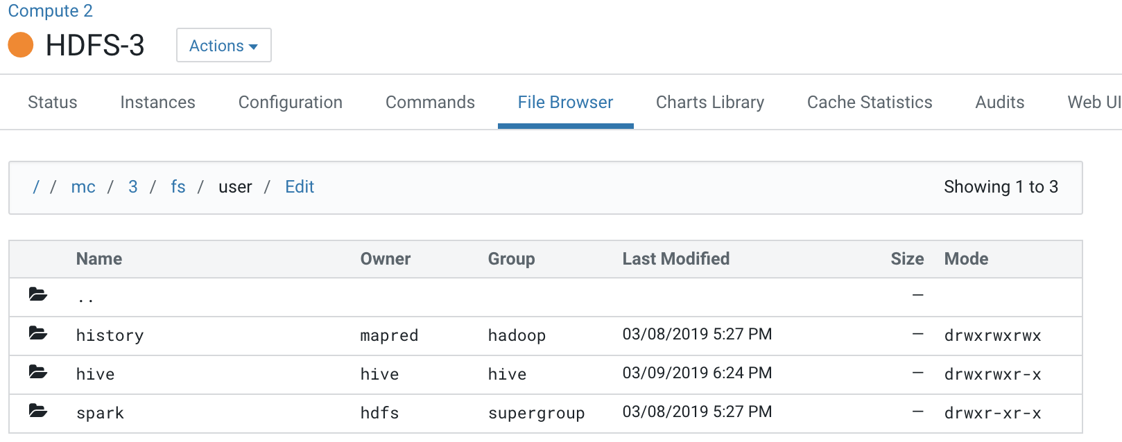 Each Compute cluster (based on its ID) gets a folder under this directory, so folder 2 belongs to Compute 1 and 3 belongs to Compute 2. The ID of the cluster can be identified from the URL used to access the cluster. Click on Compute 1 in the CM Cluster view and inspect the URL.
