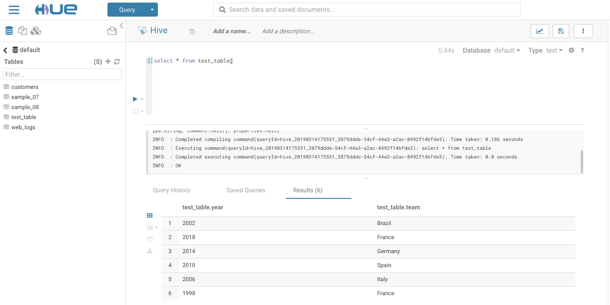 INFO : Completed executing command(queryId=hive_20190309192752_38d2b5a0-bf12-46b2-9a55-62e06beb9fb9); Time taken: 0.0 seconds +------------------+--------------------+ | test_table.year | test_table.winner | +------------------+--------------------+ | 2002 | Brazil | | 2018 | France | | 2014 | Germany | | 2010 | Spain | | 2006 | Italy | +------------------+--------------------+