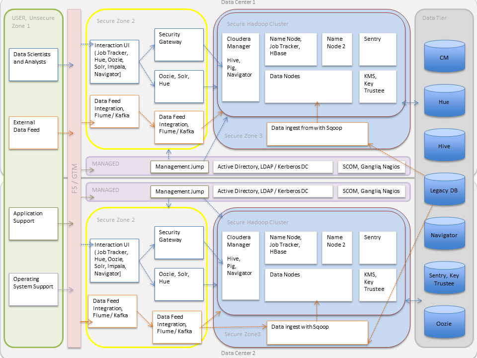 • External data streams are authenticated by mechanisms in place for Flume and Kafka. Data from legacy databases is ingested using Sqoop. Data scientists and BI analysts can use interfaces such as Hue to work with data on Impala or Hive, for example, to create and submit jobs. Kerberos authentication can be leveraged to protect all these interactions.