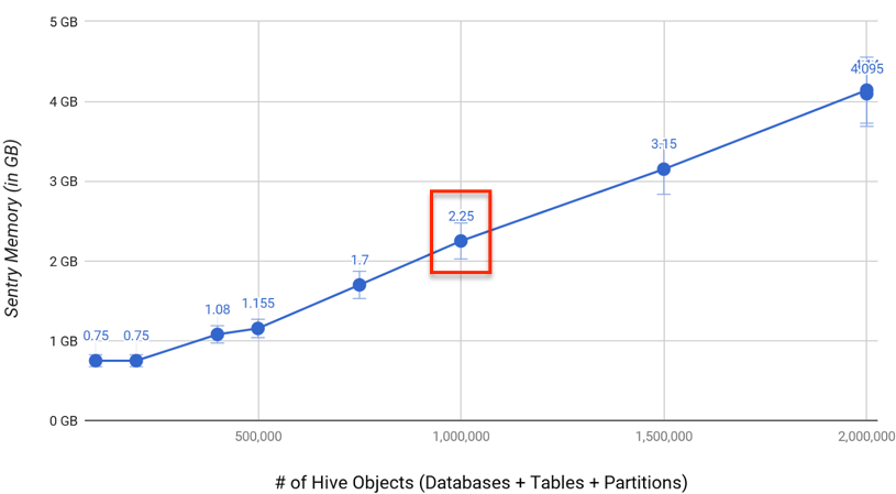 Cloudera recommends that for each Sentry host, you have 2.25 GB memory per million objects in the Hive database. Hive objects include servers, databases, tables, partitions, columns, URIs, and views.