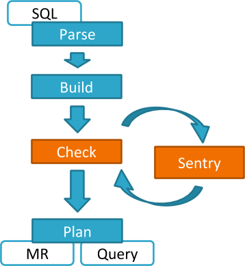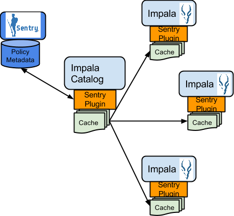 Authorization processing in Impala is similar to that in Hive. The main difference is caching of privileges. Impala’s Catalog server manages caching schema metadata and propagating it to all Impala server nodes. This Catalog server caches Sentry metadata as well. As a result, authorization validation in Impala happens locally and much faster.